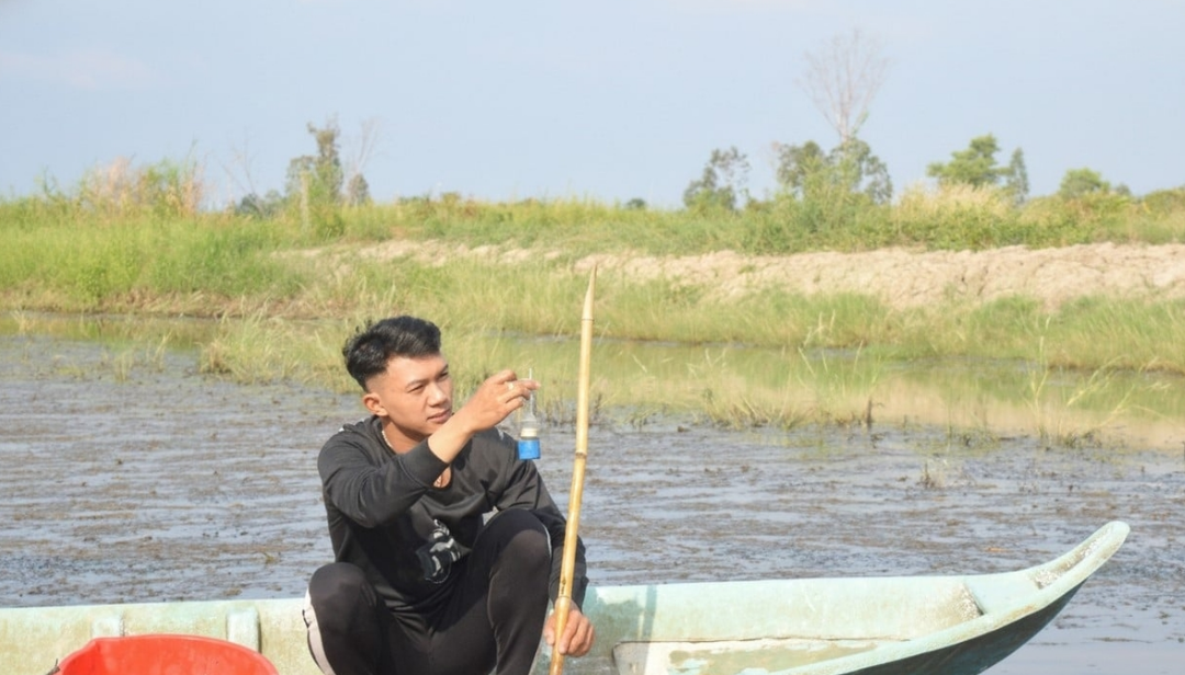 Nông dân đo, kiểm tra độ mặn nước nhằm tránh hiện tượng tôm giống bị sốc môi trường khi thả nuôi do độ mặn ao nuôi quá thấp hoặc quá cao. Ảnh: Trung Chánh.